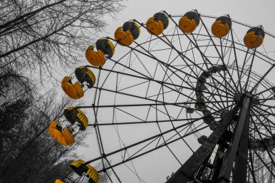 There were no other cars but ours on the long, abandoned motorway to Pripyat. The last living souls we’d seen were the last chance saloon keepers and armed guards at the Exclusion Zone Border about 15 miles ago. The pure white snow blanketing the landscape is dotted with triangular red on yellow radiation hazard signs, along with occasional animal tracks. The flat, marshy terrain is oozing with mist, drifting above the fallow fields and over the Red Forest in the near distance. It’s named so after its ancient pines were killed by intense radiation from the burning reactor, turning from lush green into an eternal autumn’s ginger brown. We are making a short stop by an abandoned farm. The roof of the dacha, the main cottage, has partially collapsed. Inside, the floorboards are rotting away, and pale blue paint is flaking off its walls. Beyond it, a pair of wild dogs are savaging the carcass of a dead deer. One of them is staring right at me while gnawing at a bloody femur. In the distance, I can just make the outline of Pripyat’s high rises towering above the treeline. It is a post-apocalyptic landscape I’d previously only encountered in literature or video games – but here I am, standing right in the middle of an entire sub-culture’s ground zero. This where science fiction meets reality, and vision becomes a crumbling, yet tangible truth.
